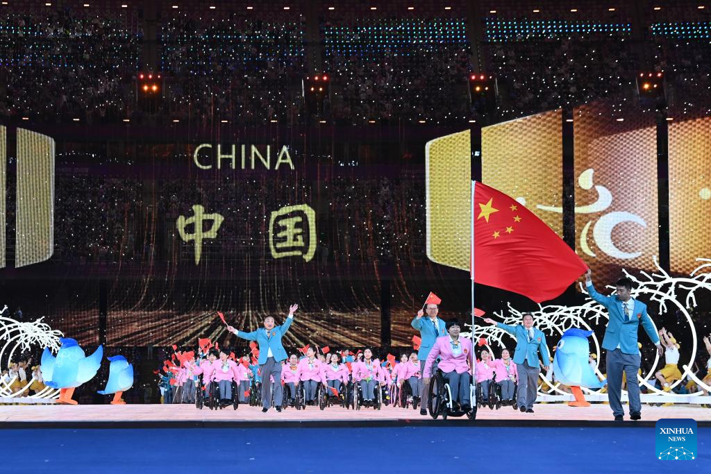Delegation of China parade into the Hangzhou Olympic Sports Center Stadium during the opening ceremony of the 4th Asian Para Games in Hangzhou of east China's Zhejiang Province, on Oct. 22, 2023. (Xinhua/Hu Xingyu)
