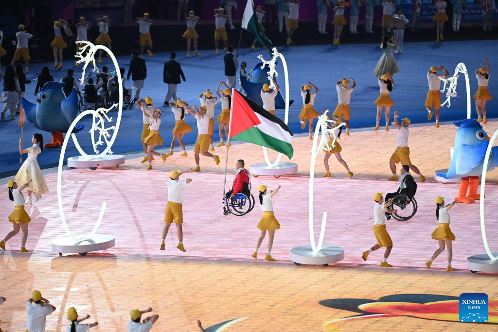 Delegation of Palestine parade into the Hangzhou Olympic Sports Center Stadium during the opening ceremony of the 4th Asian Para Games in Hangzhou of east China's Zhejiang Province, on Oct. 22, 2023. (Xinhua/Xu Yu)
