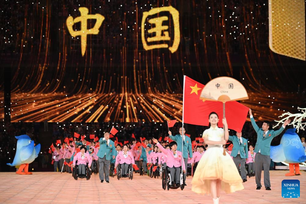 Delegation of China parade into the Hangzhou Olympic Sports Center Stadium during the opening ceremony of the 4th Asian Para Games in Hangzhou of east China's Zhejiang Province, on Oct. 22, 2023. (Xinhua/Bei He)