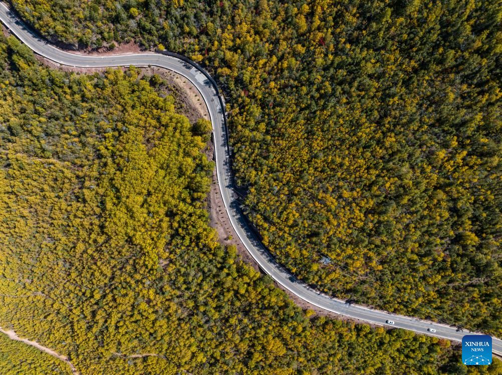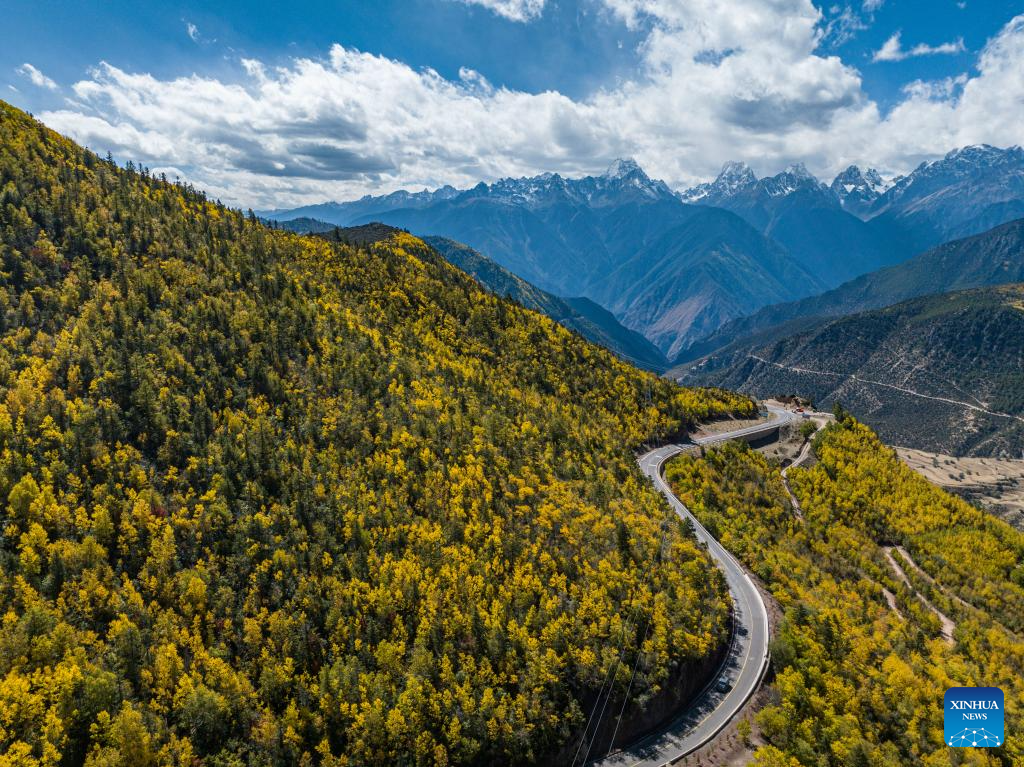 This aerial photo shows autumn scenery of Hongla Mountain in Mangkam County, Qamdo, southwest China's Tibet Autonomous Region, Oct. 20, 2023. (Xinhua/Sun Fei)