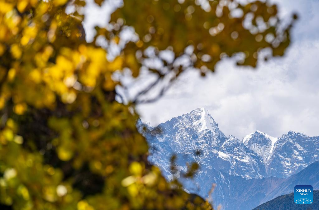 This photo shows autumn scenery of Hongla Mountain with snow mountains in the background in Mangkam County, Qamdo, southwest China's Tibet Autonomous Region, Oct. 20, 2023. (Xinhua/Sun Fei)