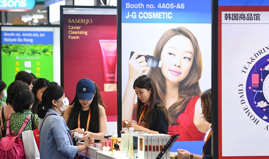 This photo taken on April 12, 2023 shows booths of South Korean enterprises at the third China International Consumer Products Expo in Haikou, south China's Hainan Province. (Xinhua/Yang Guanyu)