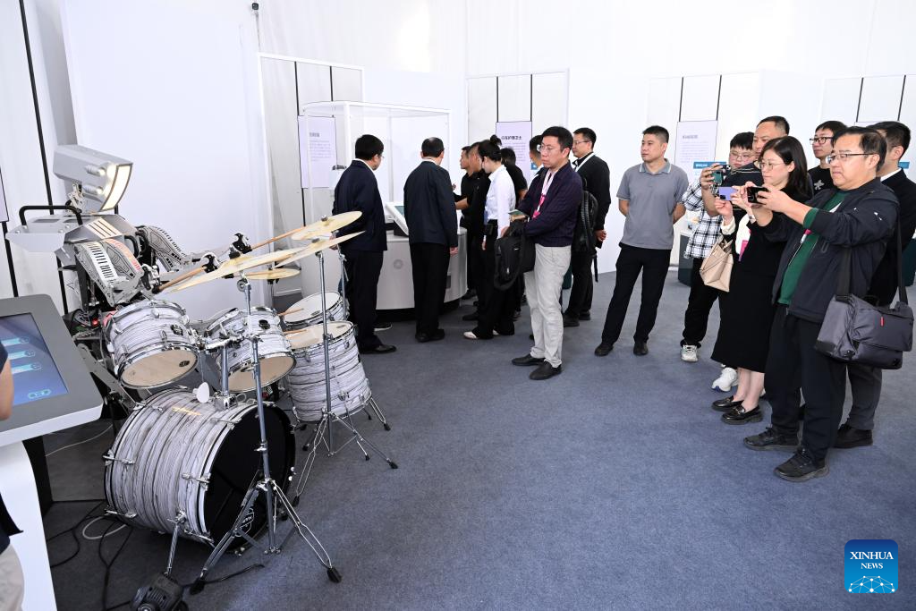 People look at a drum robot during the 6th World Voice Expo in Hefei, east China's Anhui Province, Oct. 24, 2023. The 6th World Voice Expo and the iFlytek 1024 Global Developer Festival kicked off here on Tuesday. The latest achievements and application of AI technology will be on display at the 6-day event. (Xinhua/Zhou Mu)