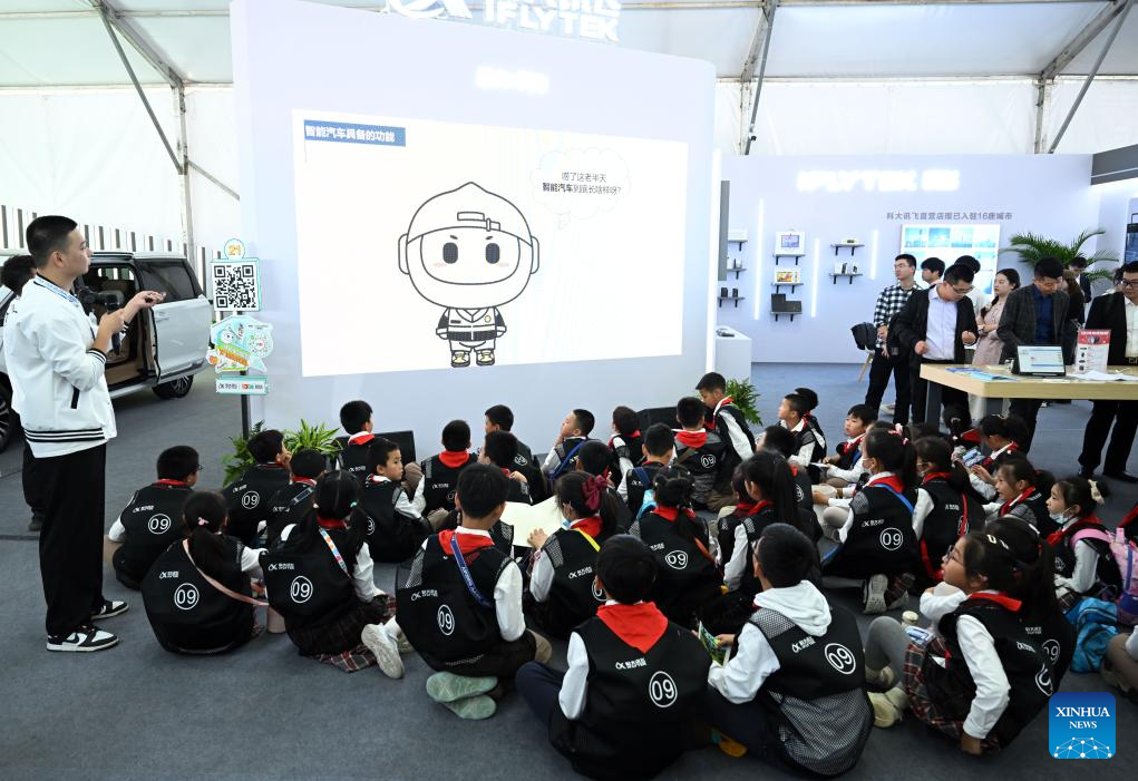 Children attend a study camp during the 6th World Voice Expo in Hefei, east China's Anhui Province, Oct. 24, 2023. The 6th World Voice Expo and the iFlytek 1024 Global Developer Festival kicked off here on Tuesday. The latest achievements and application of AI technology will be on display at the 6-day event. (Xinhua/Zhou Mu)