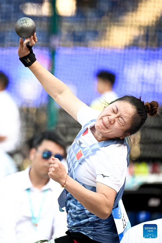Tian Yuxin of China competes during the Women's Shot Put F57 final Group A of Athletics at the 4th Asian Para Games in Hangzhou, east China's Zhejiang Province, Oct. 24, 2023. (Xinhua/Jiang Han)