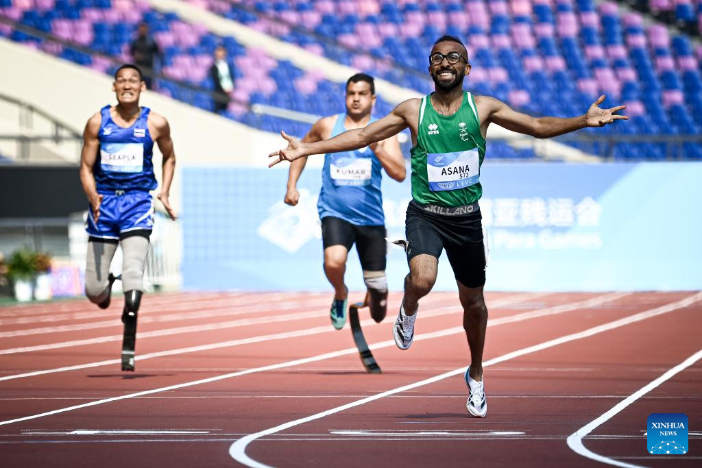 Gold medalist Mehrdad Moradi of Iran sprints during the Men's 100m T12 final of Athletics at the 4th Asian Para Games in Hangzhou, east China's Zhejiang Province, Oct. 24, 2023. (Xinhua/Jiang Han)