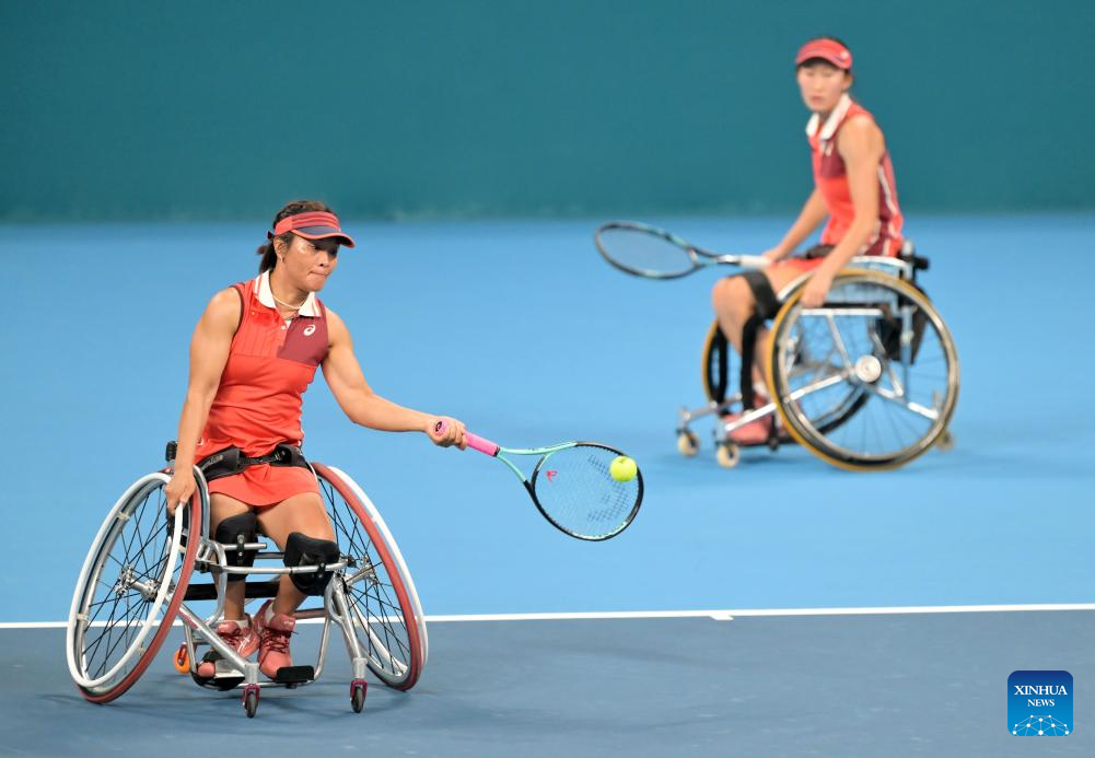 China's Guo Luoyao/Zhu Zhenzhen (L) compete during the Women's Doubles Semifinal of Wheelchair Tennis against Thailand's Sakhon Khanthasit/Thipaksorn Singkeaw at the 4th Asian Para Games in Hangzhou, east China's Zhejiang Province, Oct. 24, 2023. (Xinhua/Cai Yang)