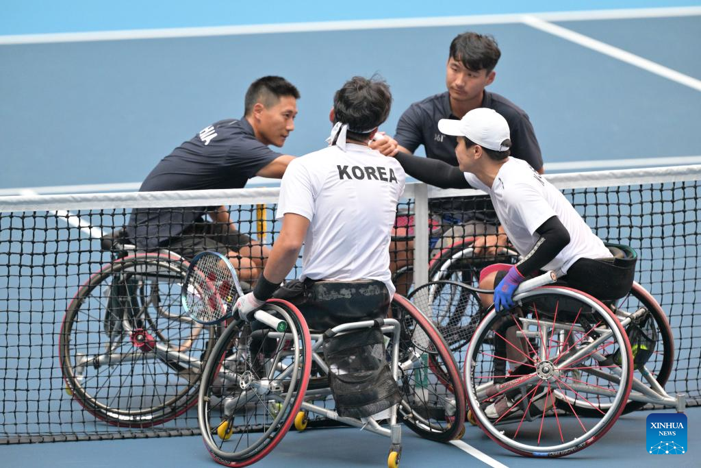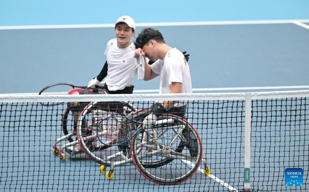 South Korea's Im Howon (R) is comforted by his teammate Han Sungbong after winning the Men's Doubles Quarterfinal of Wheelchair Tennis against China's Dong Shunjiang/Ji Zhenxu at the 4th Asian Para Games in Hangzhou, east China's Zhejiang Province, Oct. 24, 2023. (Xinhua/Cai Yang)