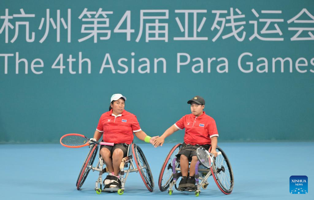 Thailand's Sakhon Khanthasit(L)/Thipaksorn Singkeaw clap hands during the Women's Doubles Semifinal of Wheelchair Tennis against China's Guo Luoyao/Zhu Zhenzhen at the 4th Asian Para Games in Hangzhou, east China's Zhejiang Province, Oct. 24, 2023. (Xinhua/Cai Yang)
