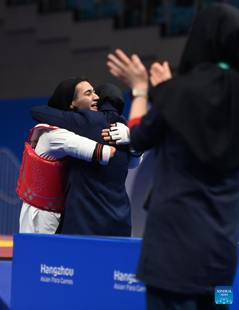 Iran's Mahdi Pourrahnamaahmadgourabi (L) celebrates after winning the Men's K44 70KG Gold Medal Contest of Taekwondo against China's Chen Shihe at the 4th Asian Para Games in Hangzhou, east China's Zhejiang Province, Oct. 24, 2023. (Xinhua/Huang Zongzhi)