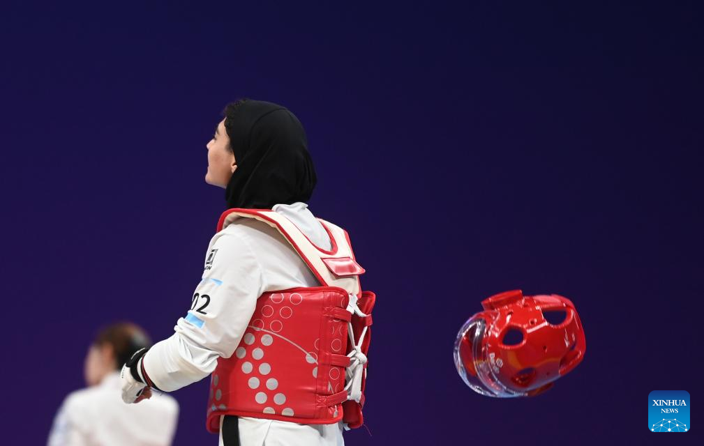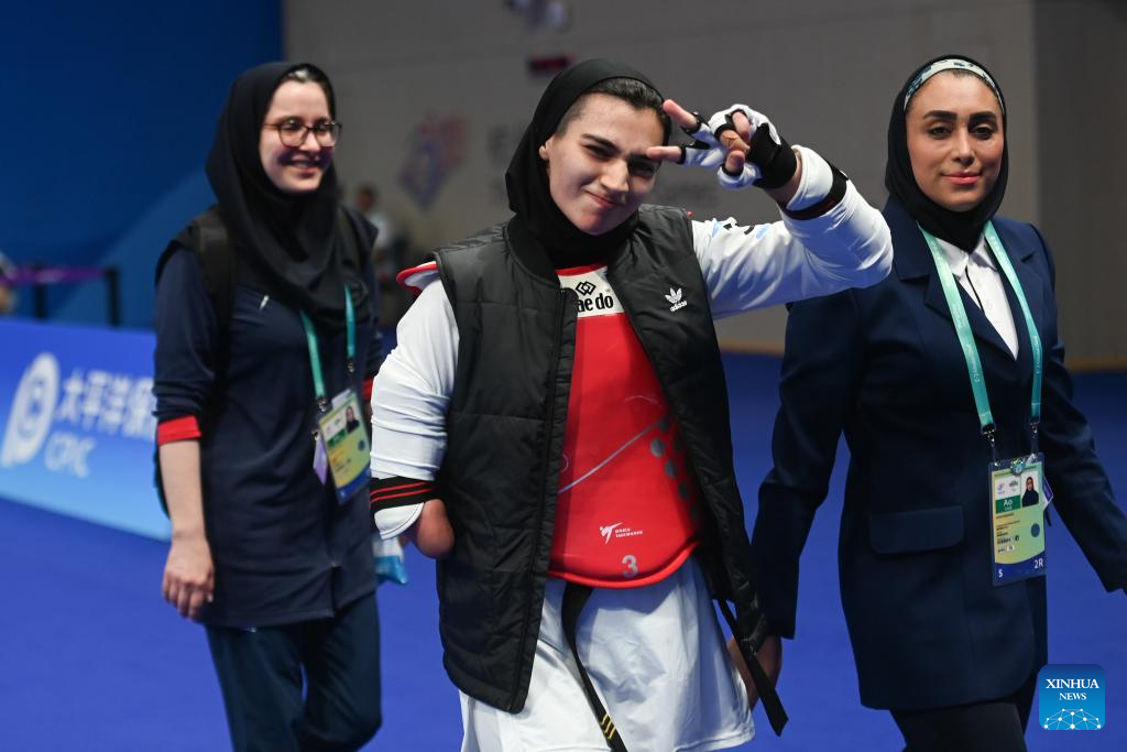 Iran's Roza Ebrahimi (C) celebrates after winning the Women's K44 57KG Gold Medal Contest of Taekwondo against Kazakhstan's Kamilya Dosmalova at the 4th Asian Para Games in Hangzhou, east China's Zhejiang Province, Oct. 24, 2023. (Xinhua/Huang Zongzhi)
