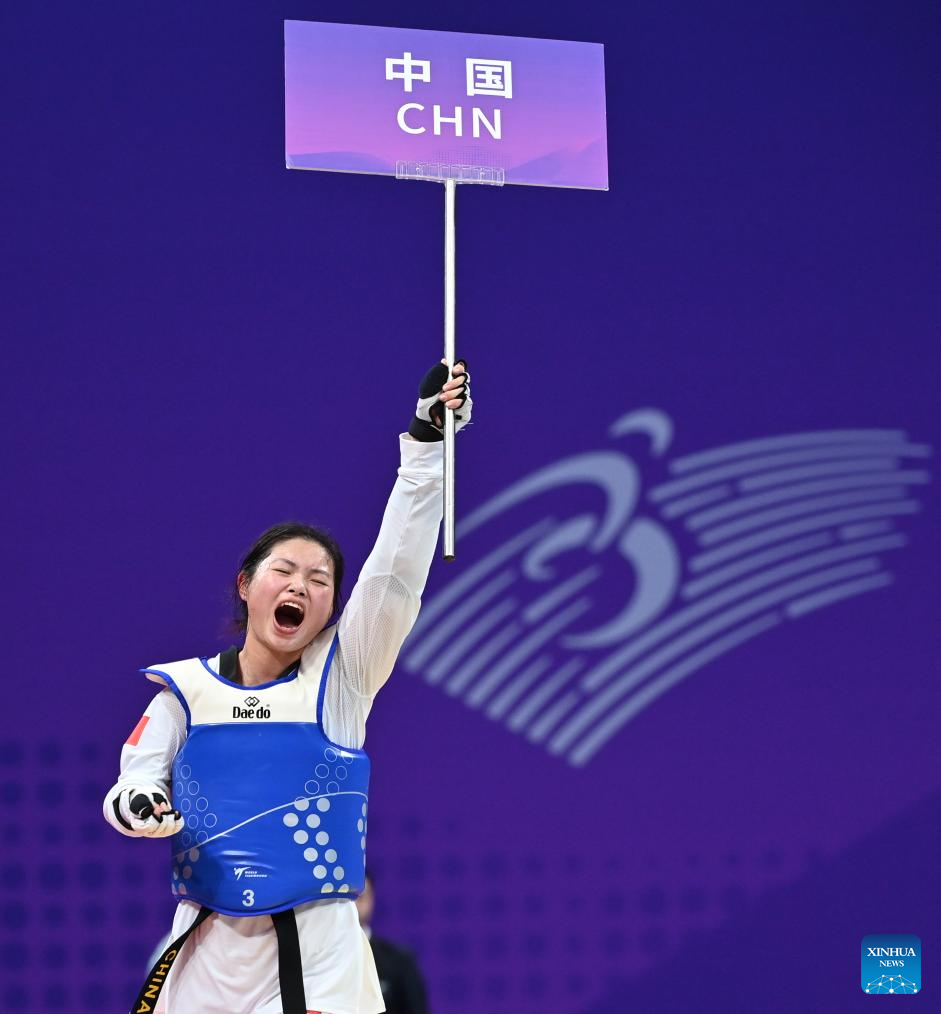 China's Yao Yinan celebrates after winning the Women's K44 65KG Gold Medal Contest of Taekwondo against Iran's Romina Chamsouraki at the 4th Asian Para Games in Hangzhou, east China's Zhejiang Province, Oct. 24, 2023. (Xinhua/Huang Zongzhi)