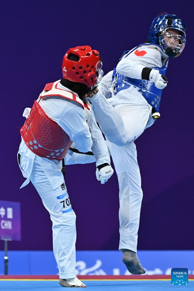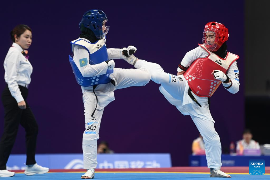 Iran's Roza Ebrahimi (R) competes against Kazakhstan's Kamilya Dosmalova during their Women's K44 57KG Gold Medal Contest of Taekwondo at the 4th Asian Para Games in Hangzhou, east China's Zhejiang Province, Oct. 24, 2023. (Xinhua/Huang Zongzhi)