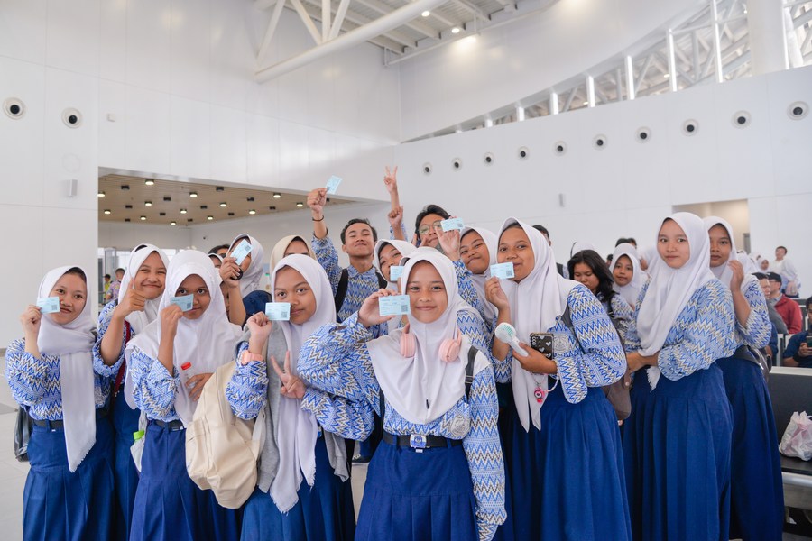 Students from Ngamprah No.3 Junior High School show their tickets before getting on board a Jakarta-Bandung High-Speed Railway (HSR) Electric Multiple Unit (EMU) train in Padalarang Station in Padalarang, Indonesia, Oct. 24, 2023. (Xinhua/Xu Qin)