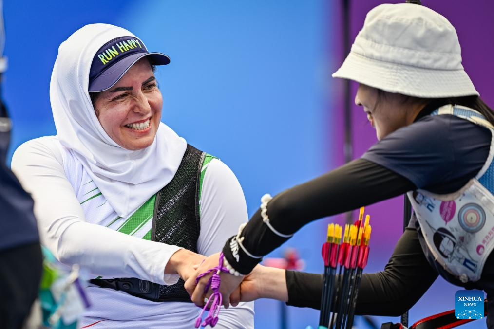 Wu Chunyan (R) of China greets Somayeh Rahimi Ghahderijani of Iran after the Women's Doubles Recurve Open Gold Medal Match of Archery between Wu Chunyan/Wu Yang of China and Zahra Nemati/Somayeh Rahimi Ghahderijani of Iran at the 4th Asian Para Games in Hangzhou, east China's Zhejiang Province, Oct. 25, 2023. (Xinhua/Wu Zhizun)