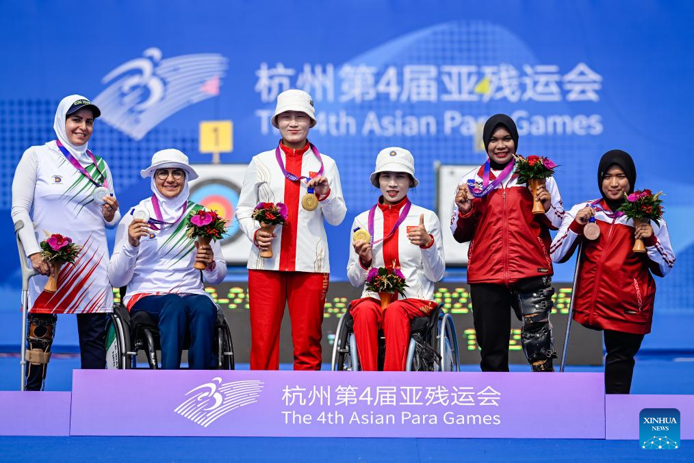 Gold medalists team China (C), silver medalists team Iran (L) and bronze medalists team Indonesia pose during the awarding ceremony for the Women's Doubles Recurve Open at the 4th Asian Para Games in Hangzhou, east China's Zhejiang Province, Oct. 25, 2023. (Xinhua/Wu Zhizun)