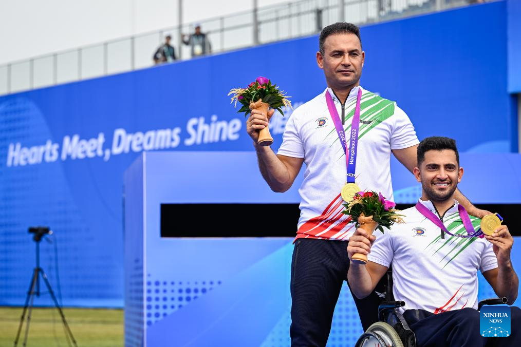 Mohammad Reza Arab Ameri (R) and Gholamreza Rahimi of Iran pose after the Men's Doubles Recurve Open Gold Medal Match of Archery between Gan Jun/Zhao Lixue of China and Mohammad Reza Arab Ameri/Gholamreza Rahimi of Iran at the 4th Asian Para Games in Hangzhou, east China's Zhejiang Province, Oct. 25, 2023. (Xinhua/Wu Zhizun)