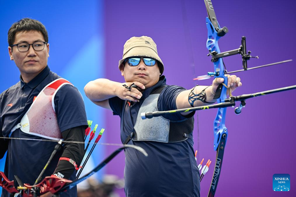 Zhao Lixue (R) of China competes during the Men's Doubles Recurve Open Gold Medal Match of Archery between Gan Jun/Zhao Lixue of China and Mohammad Reza Arab Ameri/Gholamreza Rahimi of Iran at the 4th Asian Para Games in Hangzhou, east China's Zhejiang Province, Oct. 25, 2023. (Xinhua/Wu Zhizun)