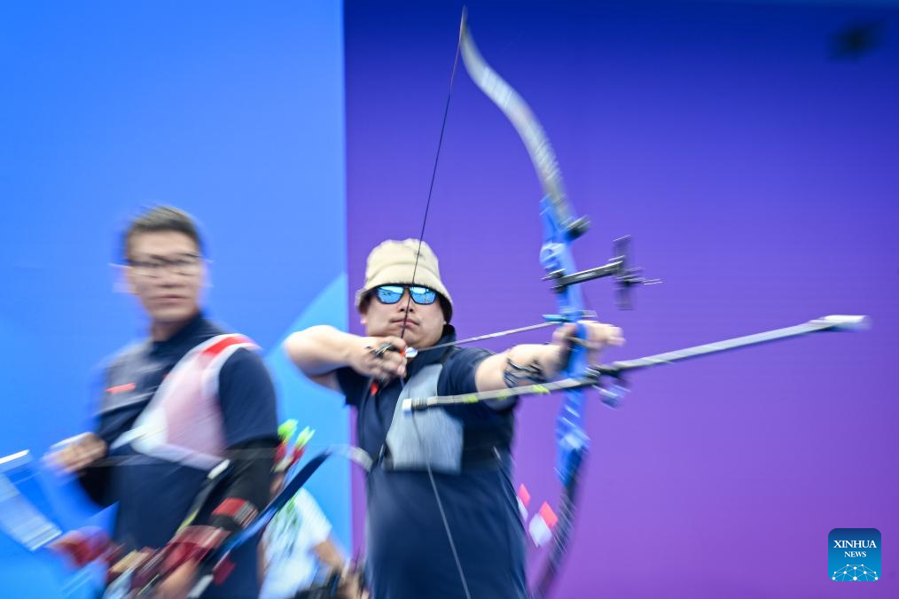 Mohammad Reza Arab Ameri (L) of Iran competes during the Men's Doubles Recurve Open Gold Medal Match of Archery between Gan Jun/Zhao Lixue of China and Mohammad Reza Arab Ameri/Gholamreza Rahimi of Iran at the 4th Asian Para Games in Hangzhou, east China's Zhejiang Province, Oct. 25, 2023. (Xinhua/Wu Zhizun)