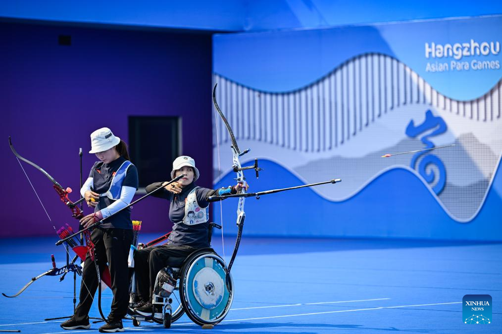 Wu Chunyan (R) of China competes during the Women's Doubles Recurve Open Gold Medal Match of Archery between Wu Chunyan/Wu Yang of China and Zahra Nemati/Somayeh Rahimi Ghahderijani of Iran at the 4th Asian Para Games in Hangzhou, east China's Zhejiang Province, Oct. 25, 2023. (Xinhua/Wu Zhizun)