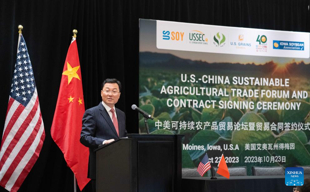 Chinese Ambassador to the United States Xie Feng speaks at the China-U.S. Sustainable Agricultural Trade Forum & Contract Signing Ceremony in Des Moines, Iowa, the United States, on Oct. 23, 2023. (Xinhua/Liu Jie)