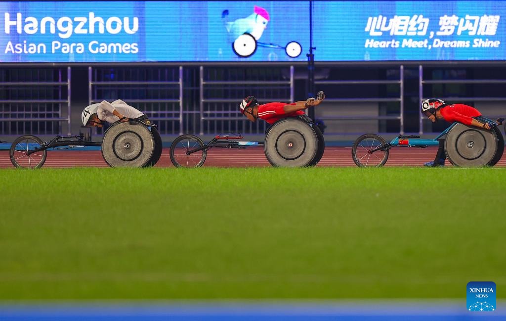 Athletes compete during the Men's 800m T54 Round 1 Heat 2 of Athletics at the 4th Asian Para Games in Hangzhou, east China's Zhejiang Province, Oct. 25, 2023. (Xinhua/Yang Zhisen)
