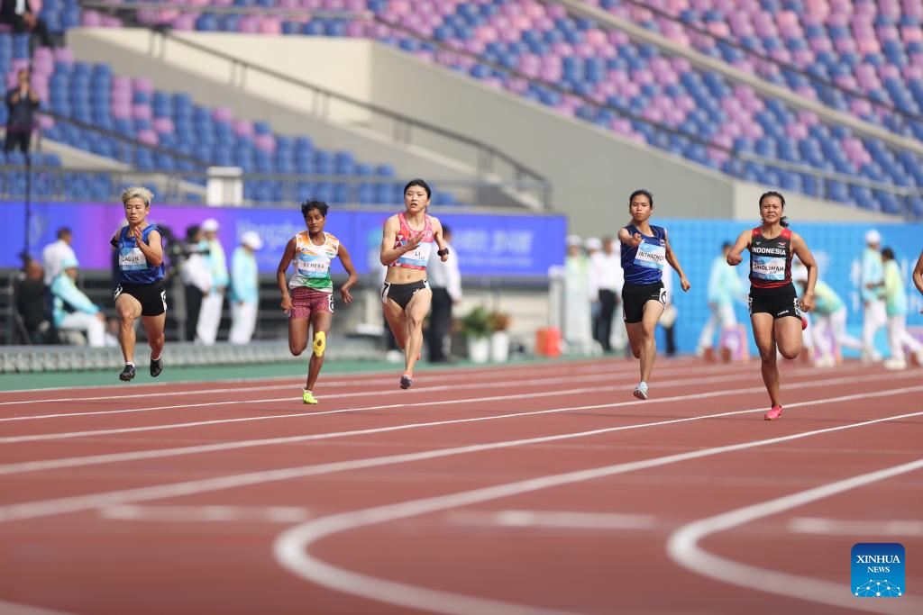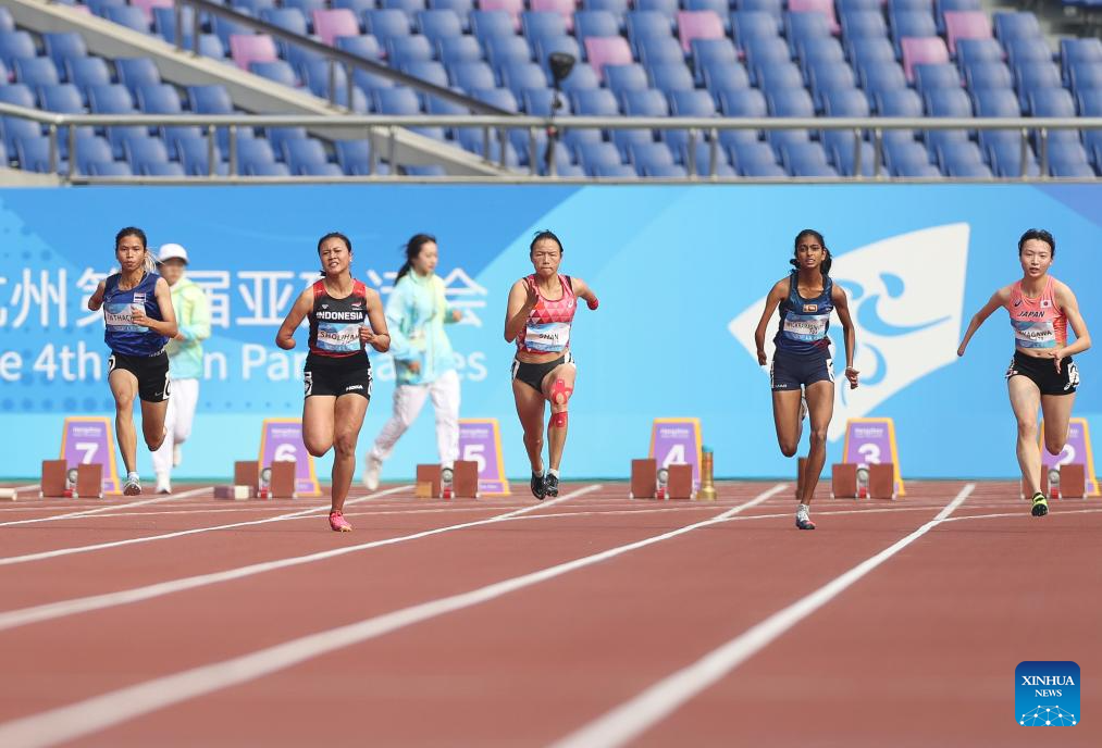 Athletes compete during the Women's 100m T47 final of Athletics at the 4th Asian Para Games in Hangzhou, east China's Zhejiang Province, Oct. 25, 2023. (Xinhua/Hu Xingyu)