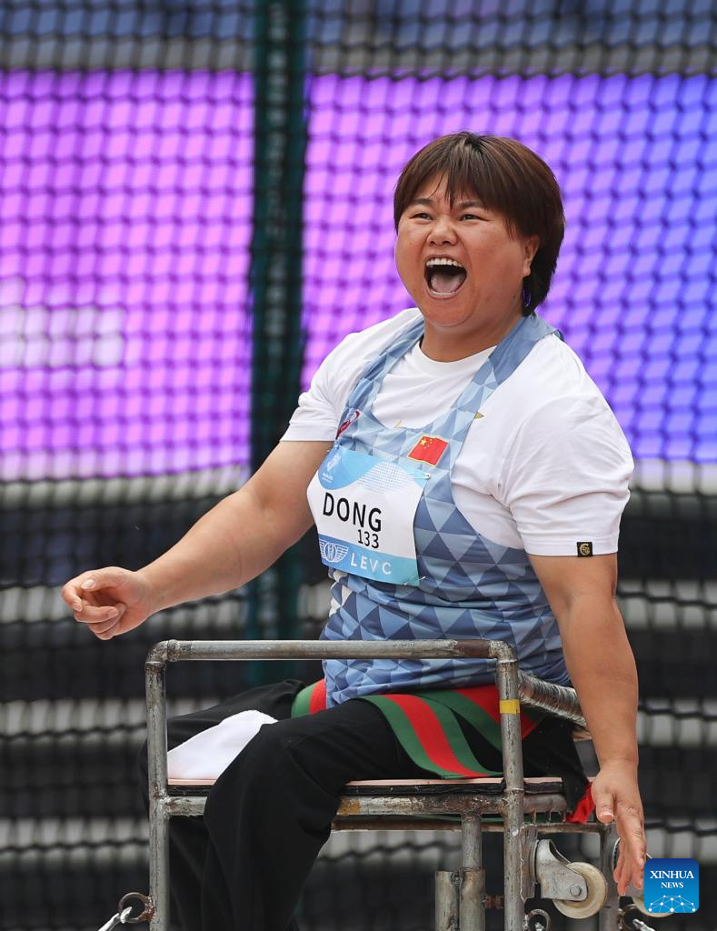 Dong Feixia of China reacts during the Women's Discus Throw F54/55 final of Athletics at the 4th Asian Para Games in Hangzhou, east China's Zhejiang Province, Oct. 25, 2023. (Xinhua/Hu Xingyu)