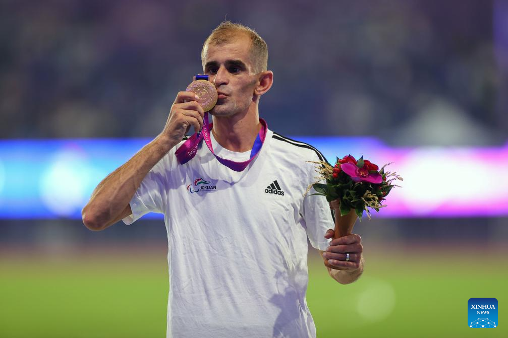Gold medalist Nabeel Khaled Ahmad Maqableh of Jordan kisses his medal during the awarding ceremony of the Men's 1500m T13 event of Athletics at the 4th Asian Para Games in Hangzhou, east China's Zhejiang Province, Oct. 25, 2023. (Xinhua/Yang Zhisen)