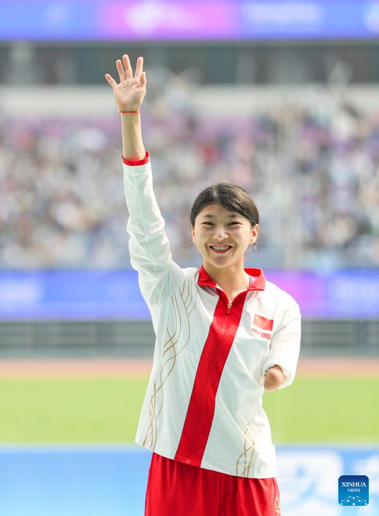 Shan Jie of China attends the awarding ceremony for the Women's 100m T47 of Athletics at the 4th Asian Para Games in Hangzhou, east China's Zhejiang Province, Oct. 25, 2023. (Xinhua/Hu Xingyu)