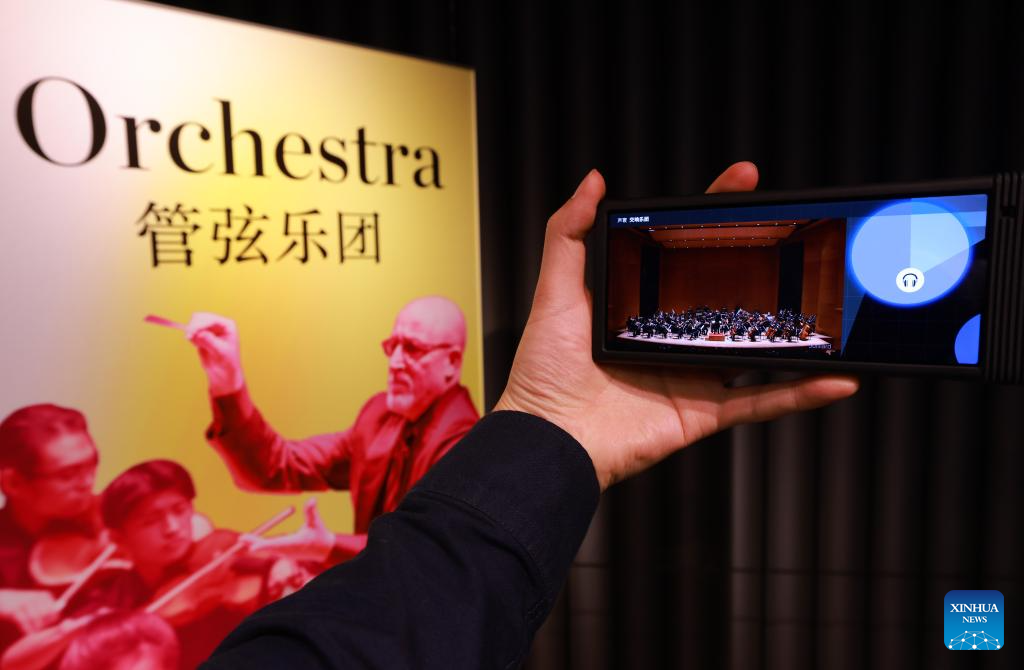 A visitor watches the performance of an orchestra through an interactive device at the Juilliard Imagination exhibition held by the Tianjin Juilliard School in north China's Tianjin, Oct. 25, 2023. The Juilliard Imagination exhibition provides the visitors with rich displays of music, dance, and drama through audio and visual interactive experiences. (Xinhua/Sun Fanyue)