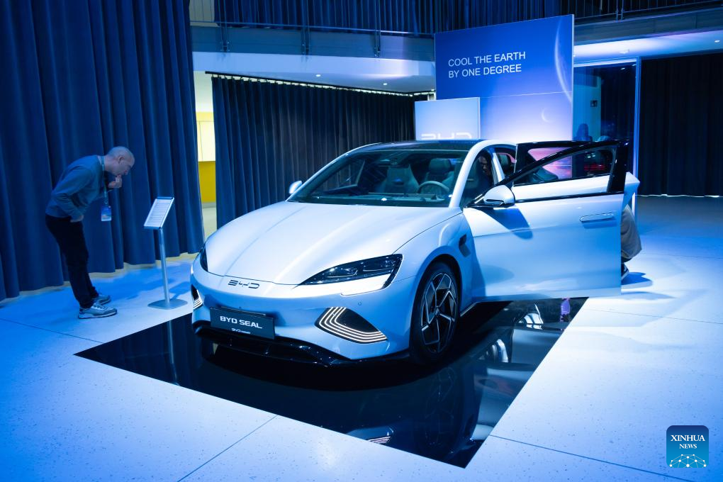 A man looks at a BYD electric vehicle in Budapest, Hungary, Oct. 17, 2023. Chinese electric vehicle manufacturer BYD has taken a leap in its global expansion by launching the sale of its new energy vehicles in Hungary on Tuesday. (Photo by Attila Volgyi/Xinhua)