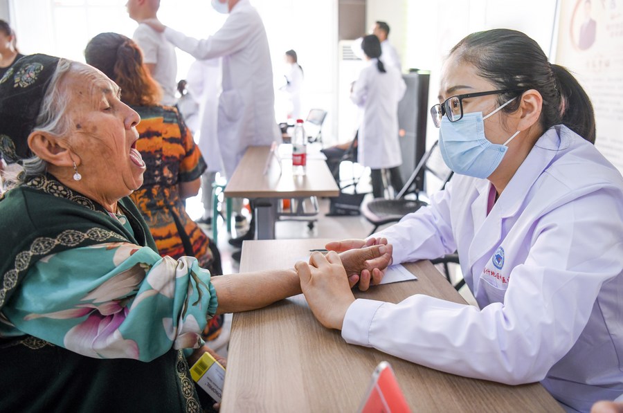 A medical worker from east China's Shandong Province gives free consultation in Kashgar, northwest China's Xinjiang Uygur Autonomous Region, Sept. 16, 2023. (Xinhua/Wang Fei)