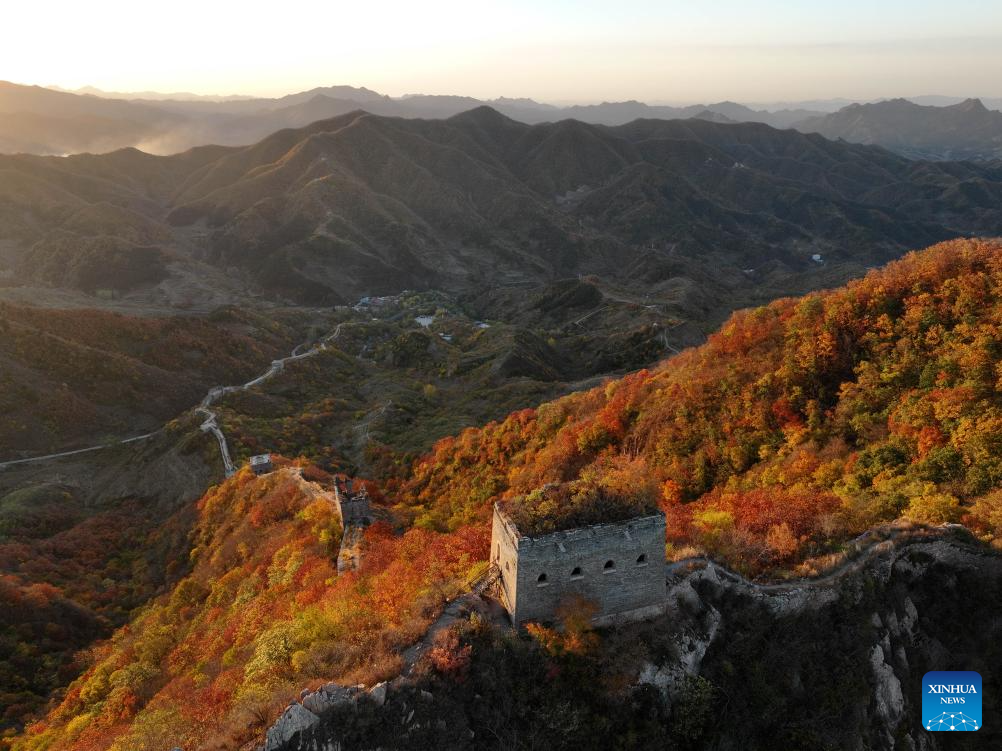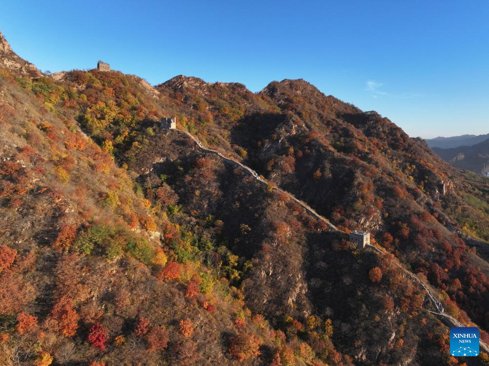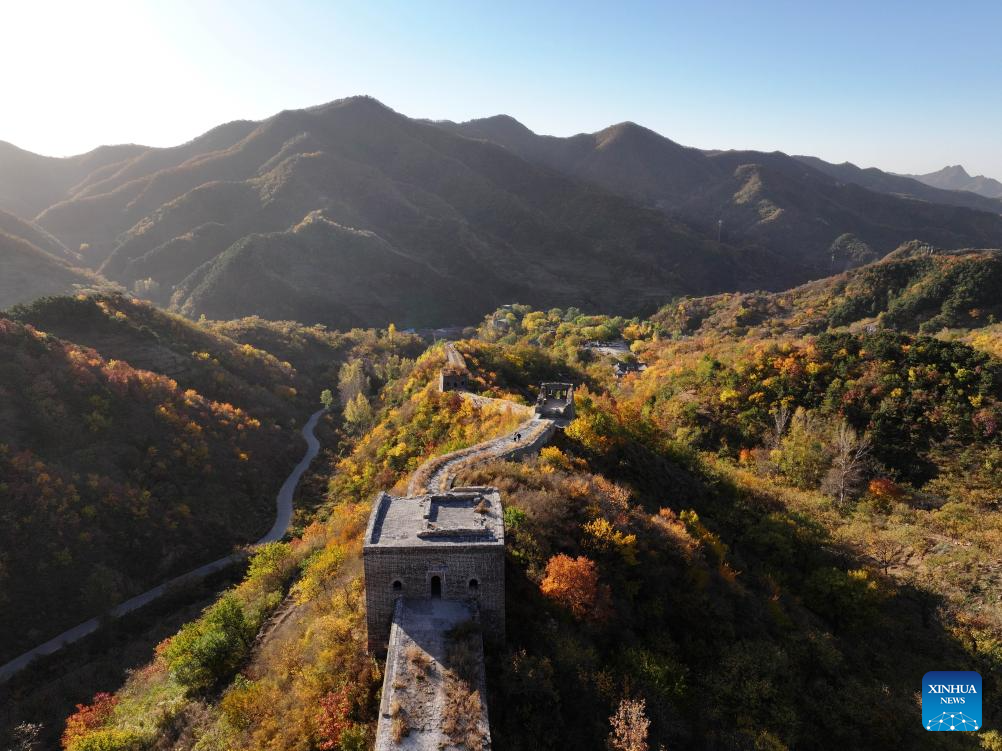 This aerial photo taken on Oct. 26, 2023 shows the autumn scenery of Qingshanguan Great Wall in Qianxi County of Tangshan, north China's Hebei Province. (Photo by Wang Aijun/Xinhua)