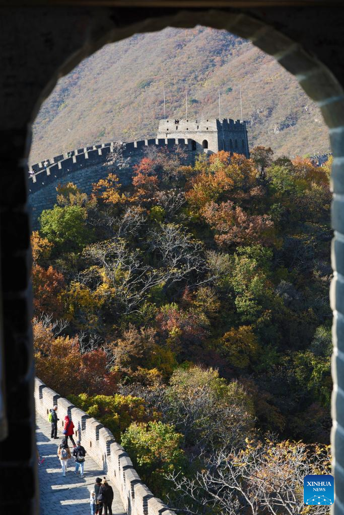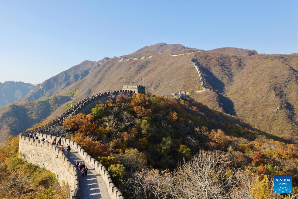 Visitors enjoy the autumn scenery of the Mutianyu section of the Great Wall in Beijing, capital of China, Oct. 26, 2023. (Xinhua/Xing Guangli)