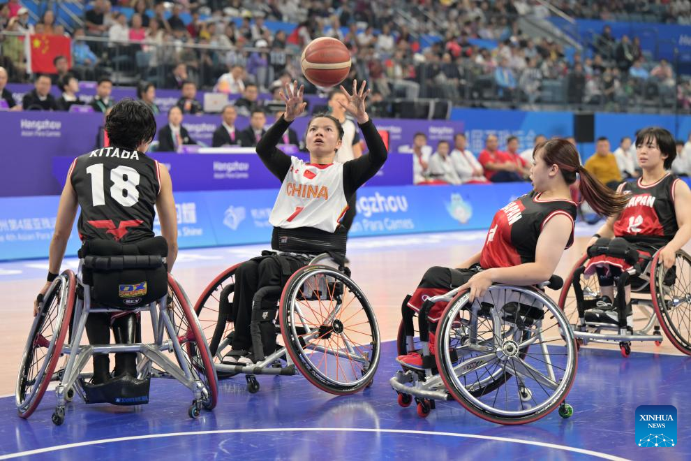 Zhang Tonglei (2nd L) of China shoots during the Women's Gold Medal Match of the Wheelchair Basketball between China and Japan at the 4th Asian Para Games in Hangzhou, east China's Zhejiang Province, Oct. 26, 2023. (Xinhua/Cai Yang)