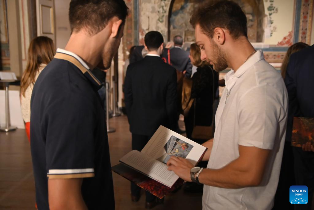 People read the book "China in Maltese Eyes" during a launch event in Valletta, Malta, on Oct. 25, 2023. The English version of the book "China in Maltese Eyes" was launched here on Wednesday by Heritage Malta and the China Cultural Center, which began collaborating on the project two years ago. The book features contributions from over 20 Maltese people of diverse backgrounds, who have shared their experiences of Chinese culture, history, and contemporary development. (Photo by Jonathan Borg/Xinhua)