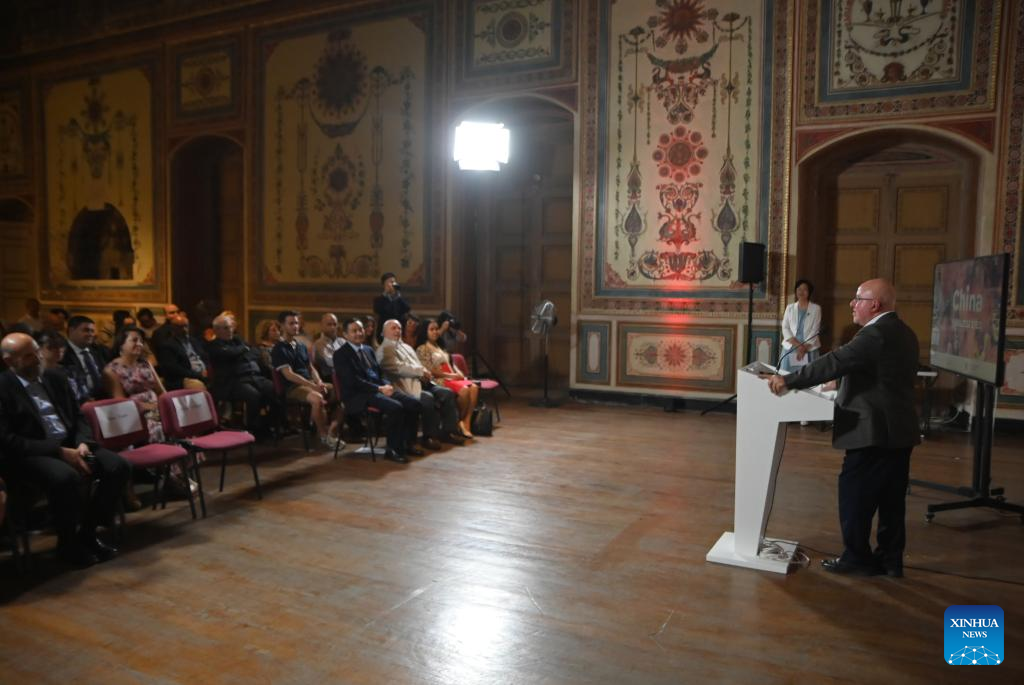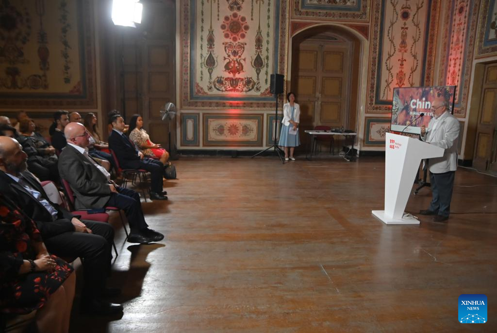 Mario Cutajar (R), chairman of Heritage Malta, speaks during the launch event of the book "China in Maltese Eyes" in Valletta, Malta, on Oct. 25, 2023. The English version of the book "China in Maltese Eyes" was launched here on Wednesday by Heritage Malta and the China Cultural Center, which began collaborating on the project two years ago. The book features contributions from over 20 Maltese people of diverse backgrounds, who have shared their experiences of Chinese culture, history, and contemporary development. (Photo by Jonathan Borg/Xinhua)
