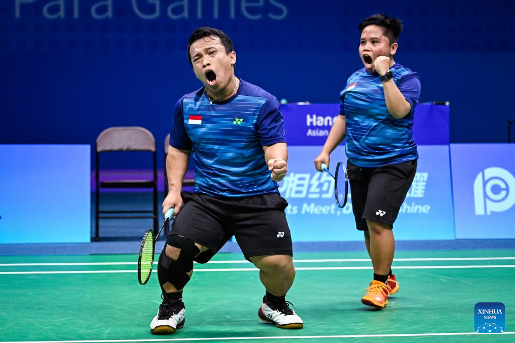 Rina Marlina/Subhan(R) of Indonesia celebrate after winning the Mixed Doubles SH6 final of Badminton against Zeng Qingtao/Lin Shuangbao of China at the 4th Asian Para Games in Hangzhou, east China's Zhejiang Province, Oct. 26, 2023. (Xinhua/Wu Zhizun)