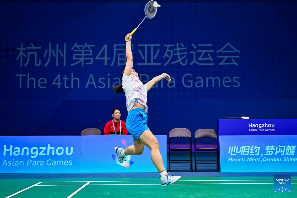 Cheng Hefang of China hits a return during the Women's Singles SL4 Final of Badminton against Leani Ratri Oktila of Indonesia at the 4th Asian Para Games in Hangzhou, east China's Zhejiang Province, Oct. 26, 2023. (Xinhua/Wu Zhizun)