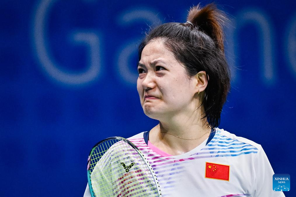 Xiao Zuxian of China reacts after winning the Women's Singles SL3 Final of Badminton against Qonitah Ikhtiar Syakuroh of Indonesia at the 4th Asian Para Games in Hangzhou, east China's Zhejiang Province, Oct. 26, 2023. (Xinhua/Wu Zhizun)