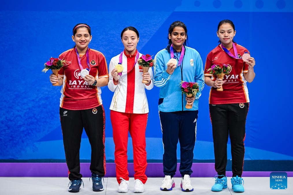 Gold medalist Cheng Hefang (2nd L) of China, silver medalist Leani Ratri Oktila (1st L) of Indonesia, bronze medalists Vaishnavi Puneyani (2nd R) of India and Khalimatus Sadiyah of Indonesia pose during the awarding ceremony of Women's Singles SL4 event of Badminton at the 4th Asian Para Games in Hangzhou, east China's Zhejiang Province, Oct. 26, 2023. (Xinhua/Wu Zhizun)