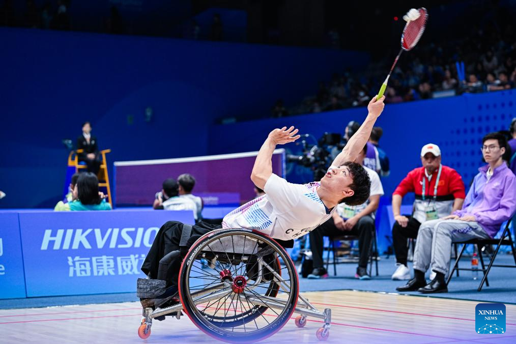 Qu Zimo of China hits a return during the Men's Singles WH1 final of Badminton against Choi Jungman of South Korea at the 4th Asian Para Games in Hangzhou, east China's Zhejiang Province, Oct. 26, 2023. (Xinhua/Wu Zhizun)