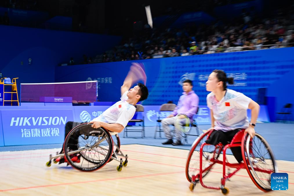 Yang Tong(L)/Li Hongyan of China compete during the Mixed Doubles WH1-WH2 final of Badminton against their compatriots Liu Yutong/Qu Zimo at the 4th Asian Para Games in Hangzhou, east China's Zhejiang Province, Oct. 26, 2023. (Xinhua/Wu Zhizun)