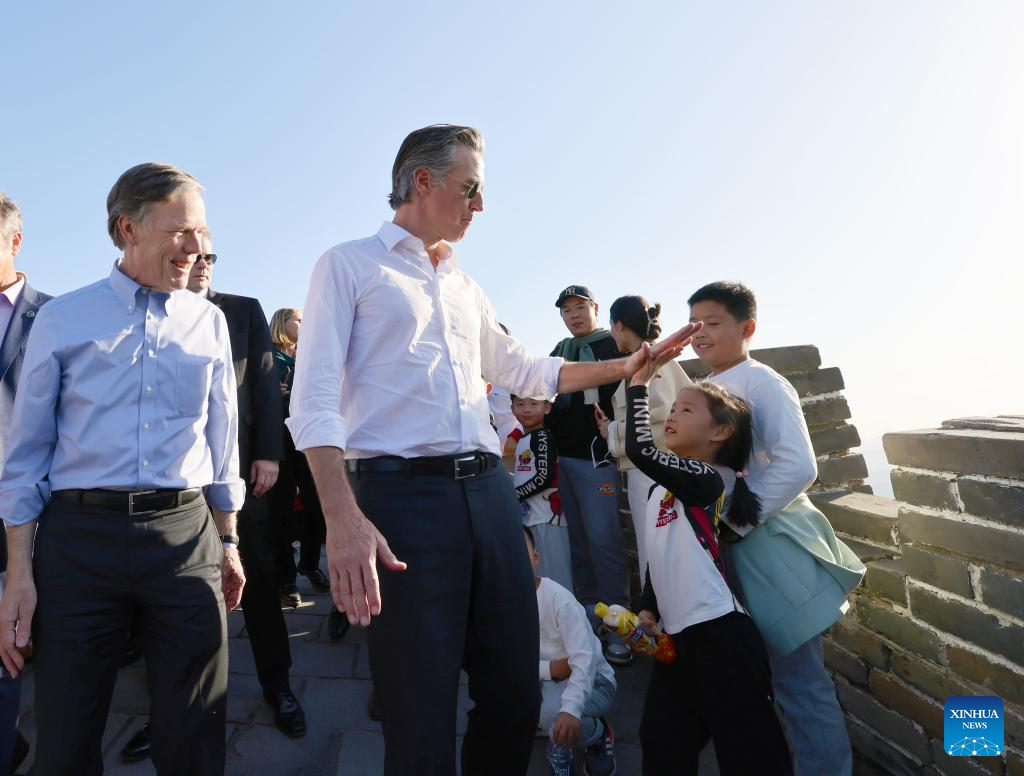Gavin Newsom (2nd L, Front), governor of the U.S. state of California, greets a visitor at the Mutianyu section of the Great Wall in Beijing, capital of China, Oct. 26, 2023. (Xinhua/Xing Guangli)