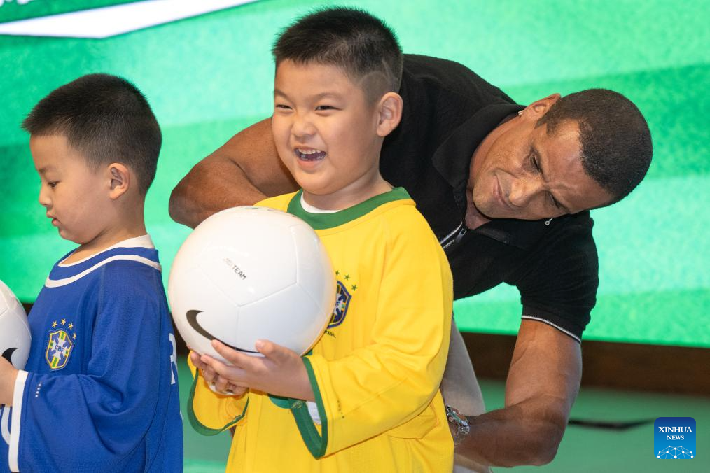 Brazilian football legend Rivaldo plays with children during an event for 2023 World Super Footballer Games in Daye, central China's Hubei Province, Oct. 26, 2023. (Xinhua/Xiao Yijiu)