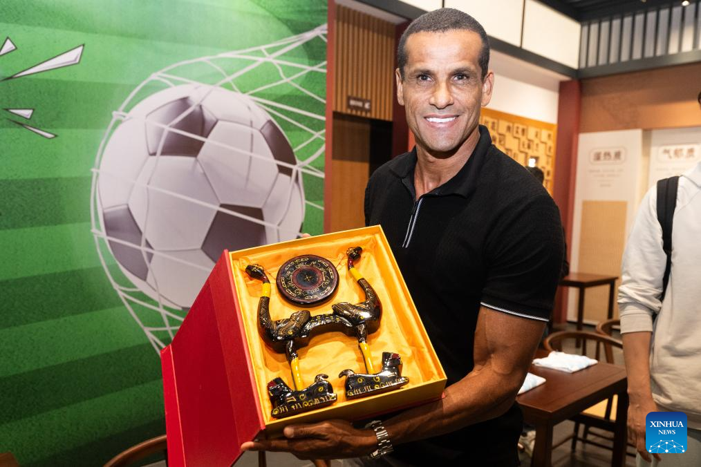 Brazilian football legend Rivaldo shows the gift he receives during an event for 2023 World Super Footballer Games in Daye, central China's Hubei Province, Oct. 26, 2023. (Xinhua/Xiao Yijiu)