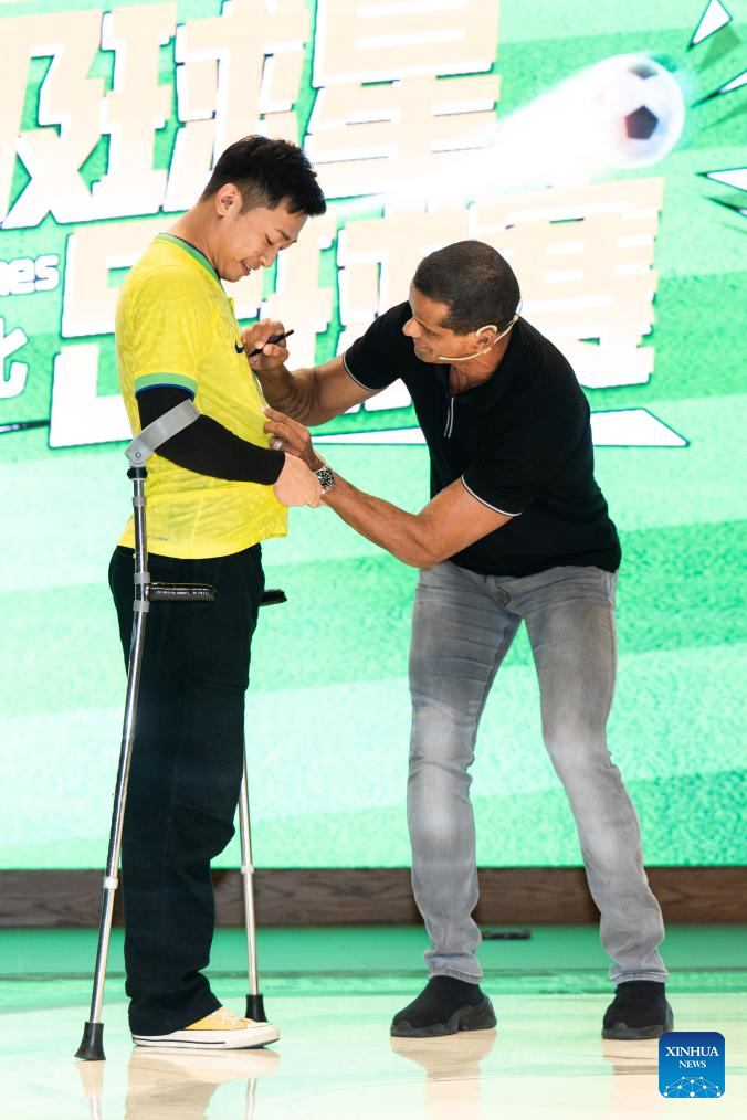 Brazilian football legend Rivaldo (R) signs for a fan during an event for 2023 World Super Footballer Games in Daye, central China's Hubei Province, Oct. 26, 2023. (Xinhua/Xiao Yijiu)