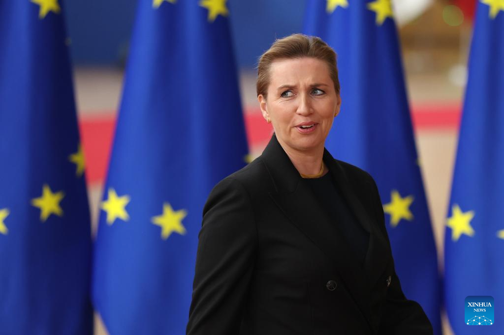 Danish Prime Minister Mette Frederiksen arrives for the EU summit in Brussels, Belgium, on Oct. 26, 2023. European Union (EU) leaders meet here on Thursday and Friday in a planned European Council summit, focusing on the conflicts between Israel and Hamas and between Ukraine and Russia. (Xinhua/Zhao Dingzhe)
