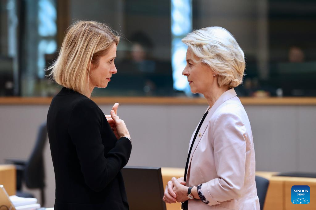 Estonian Prime Minister Kaja Kallas (L) talks with President of the European Commission Ursula von der Leyen during the EU summit in Brussels, Belgium, on Oct. 26, 2023. European Union (EU) leaders meet here on Thursday and Friday in a planned European Council summit, focusing on the conflicts between Israel and Hamas and between Ukraine and Russia. (Xinhua/Zhao Dingzhe)